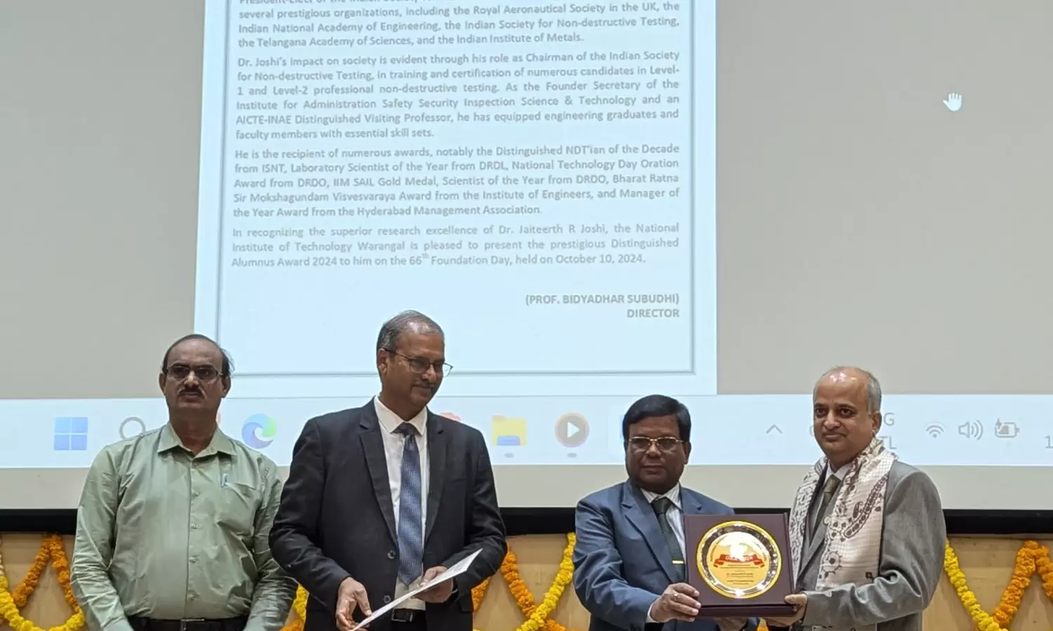 Hyderabad: Dr Jaiteerth R. Joshi, programme director at the Defence Research and Development Laboratory (DRDL), Hyderabad, has been awarded the Distinguished Alumnus Award (DAA) by the NIT-Warangal for his contributions to skill development, especially in preparing engineering students for industry challenges. The award was presented by Prof. Bidyadhar Subudhi, Director of NIT Warangal. Speaking at the event, U. Raja Babu, director general of Missiles and Strategic Systems at DRDO, discussed emerging trends in warfare technology. Other awardees were Dr Glory Swarupa, Nagarjuna Venna, Prof. Veerachary, M. Shivaji and Prof. Singh for their contributions to academic excellence, technical innovation and industry collaboration.