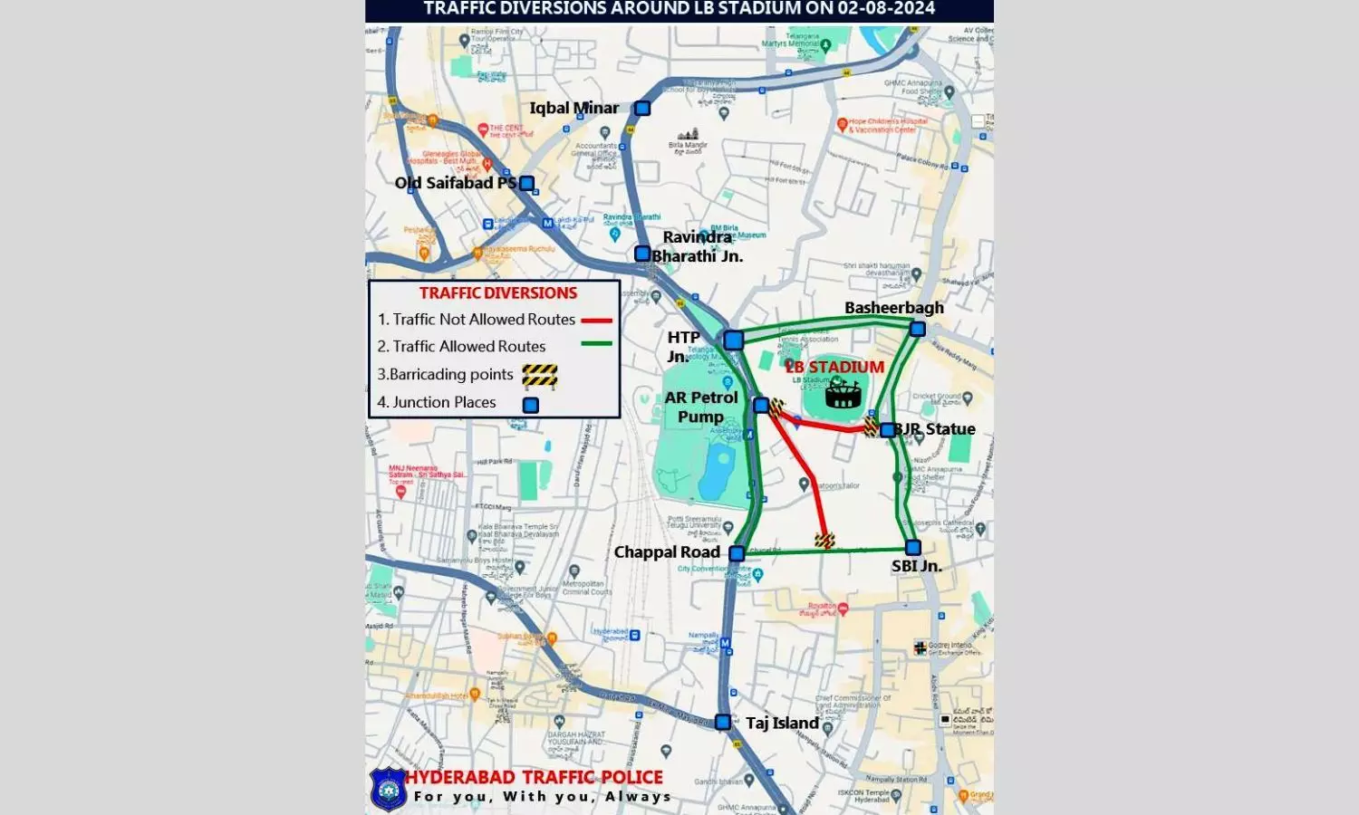 RTC buses plying from Ravindra Bharathi towards BJR Statue should avoid LB stadium main gate and take the diversion at AR Petrol Pump towards Nampally.