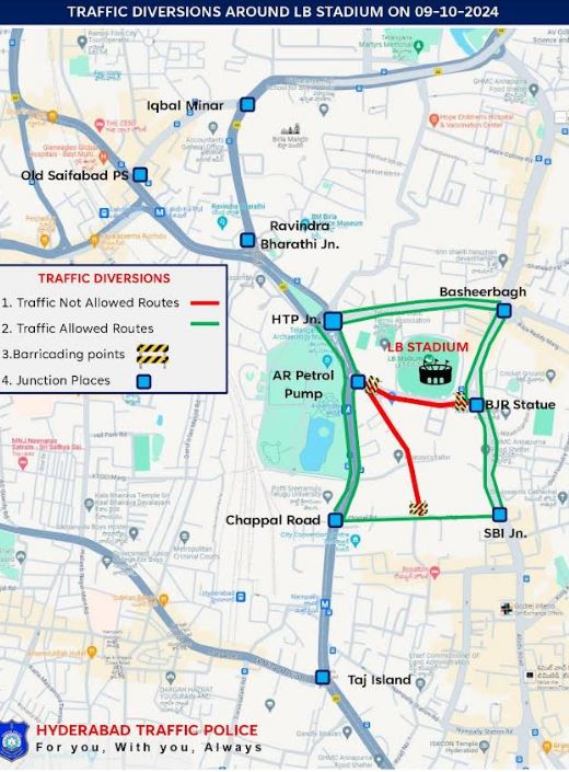 Police asked motorists to avoid the following junctions at that time: Lakdikapul, Iqbal Minar, Ravindra Bharathi, Basheerbagh, BJR statue circle, SBI Gunfoundry, AR petrol pump, KLK Building and Liberty.
