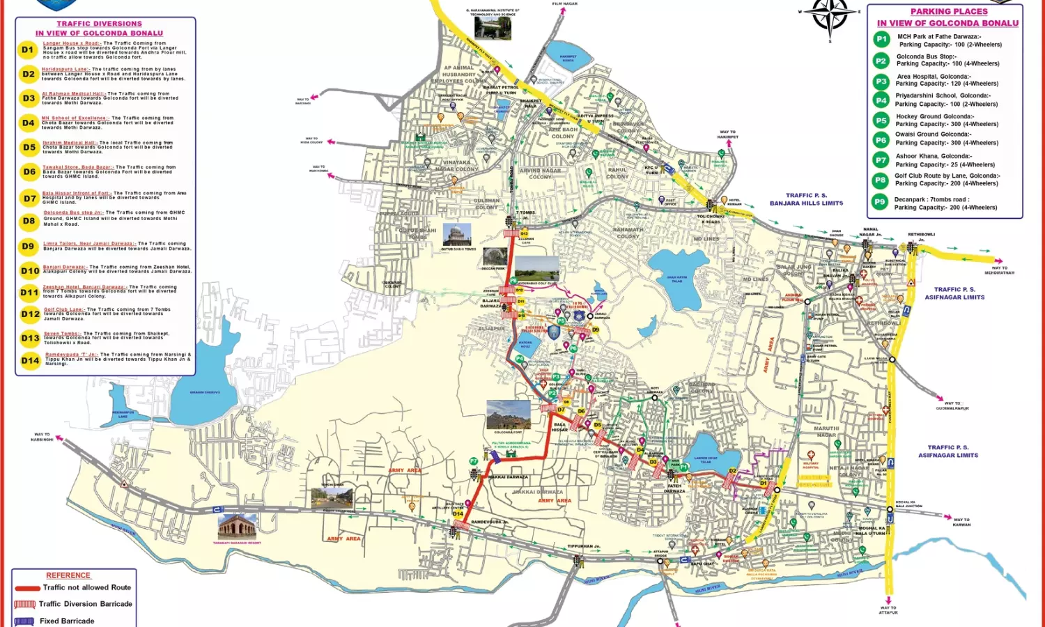 General motorists were advised to avoid the roads from Ramdevguda to Golconda Fort via Makkai Darwaza; Langar Houz to Golconda fort via Fateh Darwaza and Shaikpet Nala and Seven Tombs to Golconda fort via Banjara Darwaza from 8 am to 11 pm.Devotees were requested to park their vehicles at the designated places at Military Ground. Ramdevguda and ashoorkhana as well as at Golf Club and Deccan Park for different categories of vehicles.