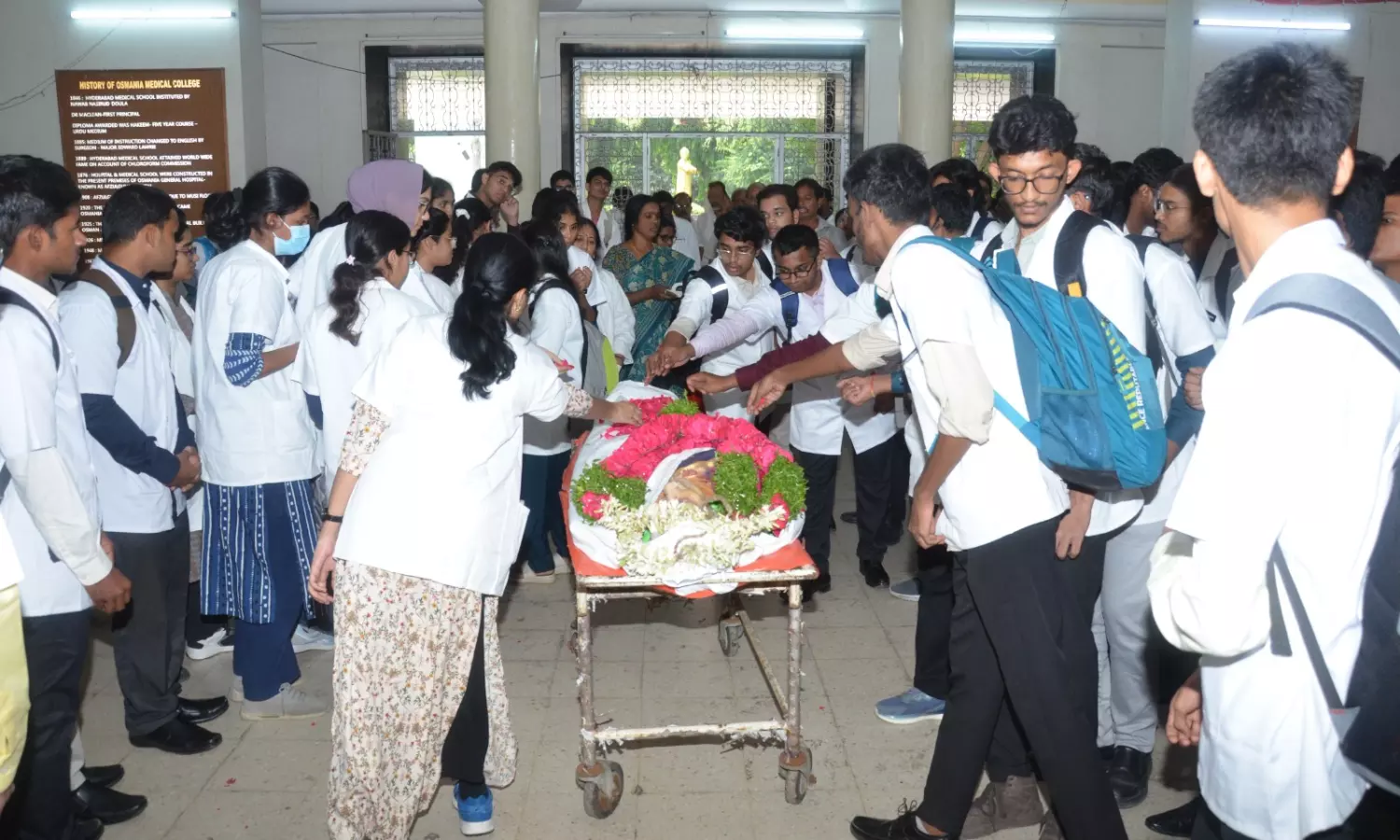 Hymavathi's passing was unexpected for the family. She had been suffering from lung disease and was dependent on an oxygen concentrator. Her body was handed over to the OMC, where students and faculty gathered to pay their respects.