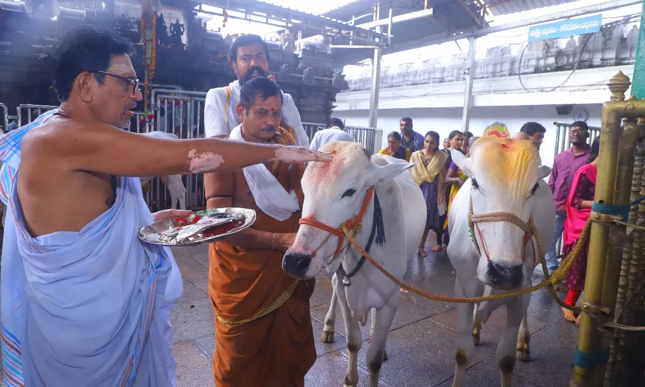 Devotees who visit Vemulawada temple offer Kode Mokku (donating cows and oxen) to the presiding deity. The donated cattle are kept in the temple’s goshala. Since it does not have enough space, the government decided to distribute extra cows to poor farmers under certain guidelines.