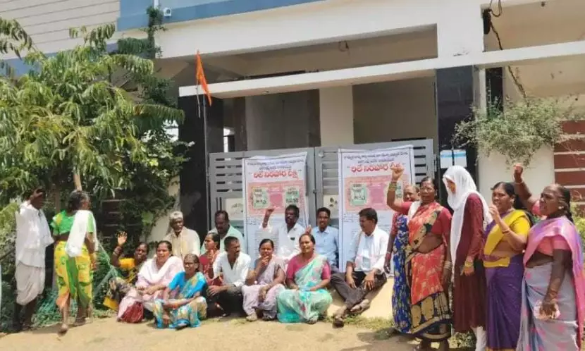Karimnagar: Families from Husnabad in Siddipet district protested outside deputy tahsildar Koyyada Lasya’s residence in Alkapuri Colony today, accusing her and husband Ramesh of a Rs 70 lakh land fraud.