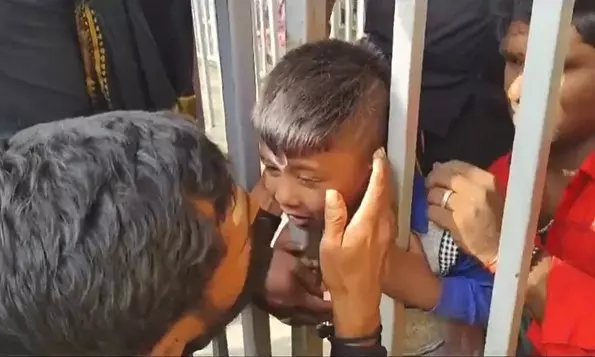 The potential accident was averted when nearby devotees and his parents noticed the situation and carefully freed his head from the grill.