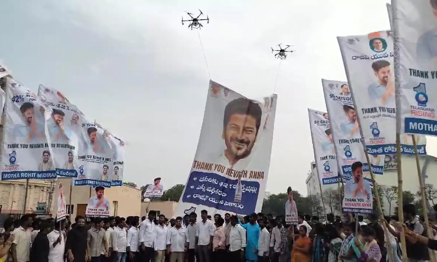 Hyderabad: The Hyderabad Youth Congress held a rally from the Rajiv Gandhi statue to the Indira Gandhi statue on NTR Marg, along with a massive flexi of Chief Minister A. Revanth Reddy to express gratitude for allotting 42 per cent reservations for the BC community, categorising SC communities to share the quota and introducing Rajiv Yuva Vikas for unemployed persons. In an innovative measure, the flexi was held by drones.