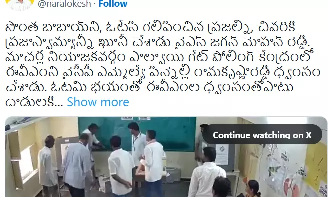 In a video which is viral on social media, Pinnelli is found to be entering the polling booth and walking straight to the corner where the EVMis placed, lift the machine and banging it to the ground.