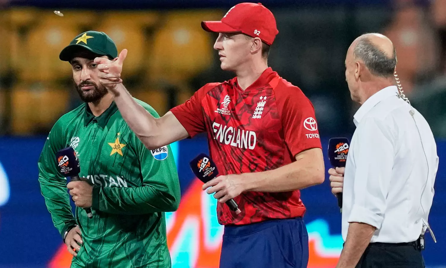 Pakistan: 164 for 9 in 20 overs (Sahibzada Farhan 63; Liam Dawson 3/24) vs England.