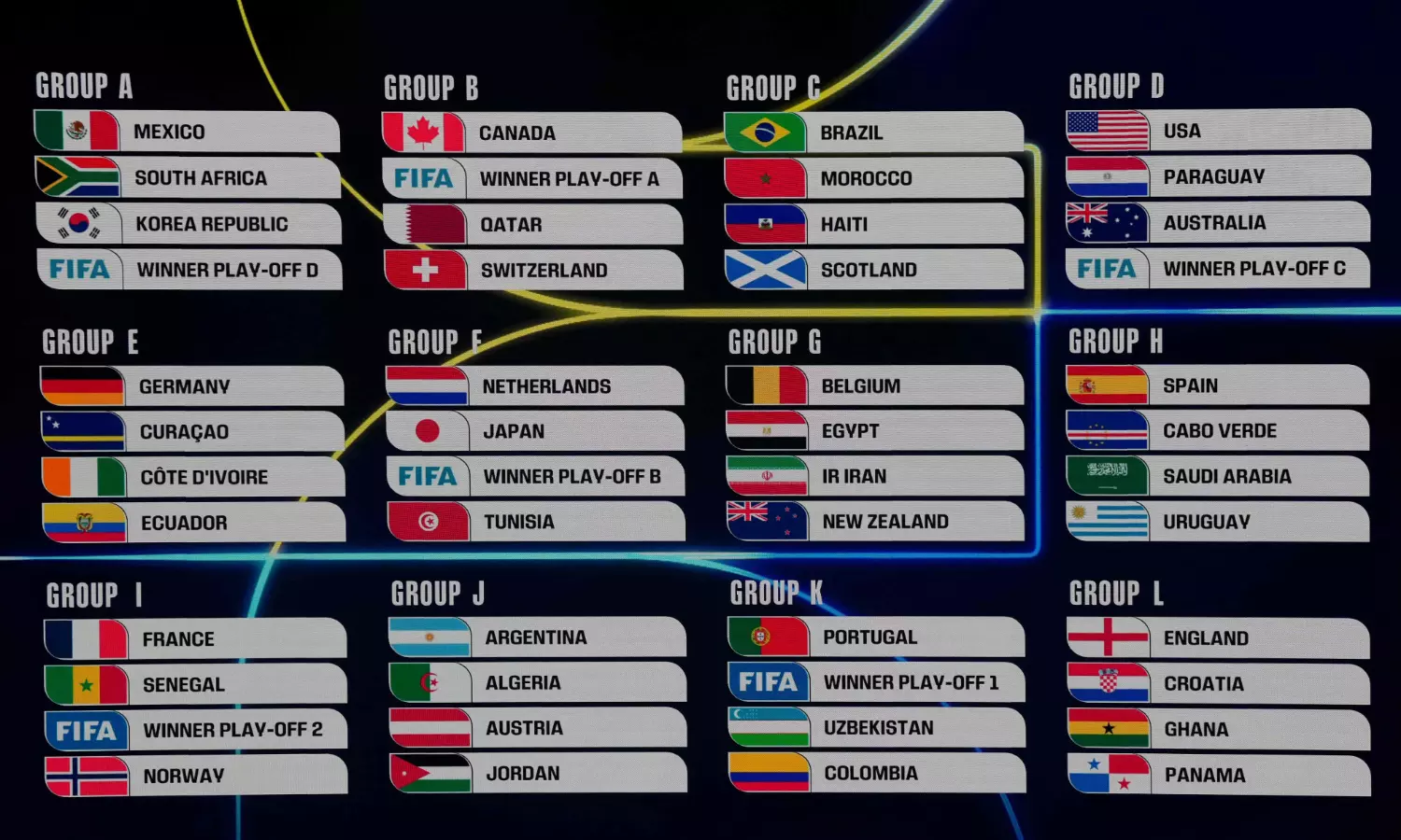 The 12 groups were announced during a ceremony attended by sports legends across multiple disciplines. England and Manchester United icon Rio Ferdinand conducted the draw, assisted by basketball great Shaquille O’Neal, NFL legend Tom Brady, ice hockey star Wayne Gretzky, and MLB standout Aaron Judge. The event was hosted by Kevin Hart, Heidi Klum, and Danny Ramirez, with performances by Andrea Bocelli, Robbie Williams, Nicole Scherzinger, Lauryn Hill, and the Village People.