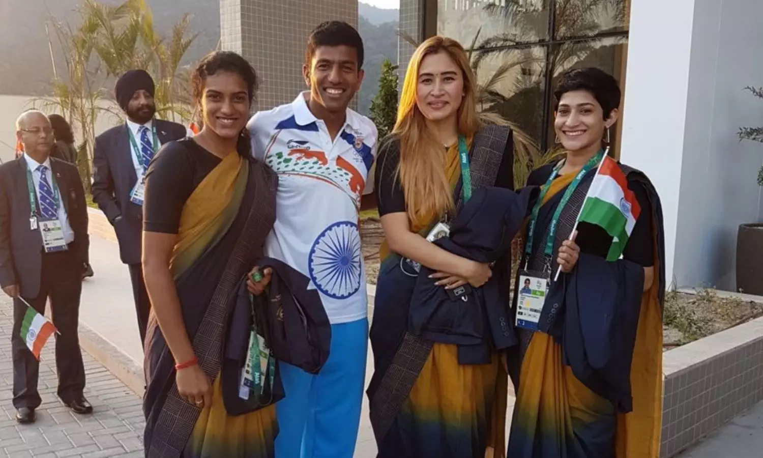 The outfits featured ikat-inspired prints and the sportswomen were dressed in ivory sarees with a tricolour border and the sportsmen wore a kurta-bundi set.