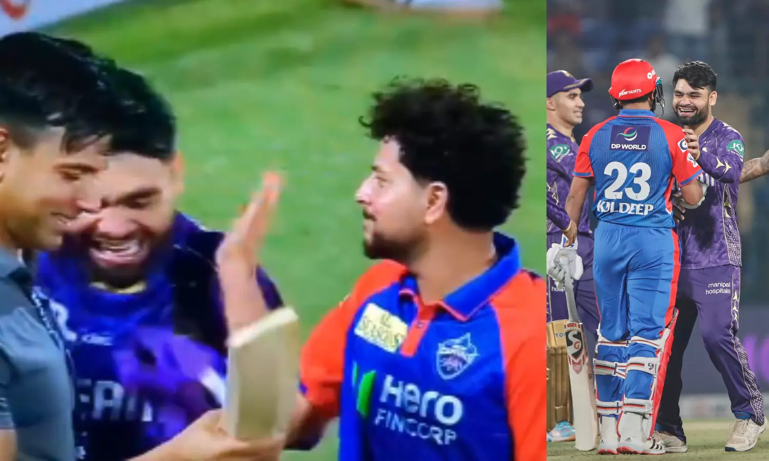 After the match that went in KKR's favor, players from both camps were having a light hearted moment. In what looked like a candid and fun episode, DC's Kuldeep Yadav suddenly slapped Rinku (probably in a playful manner) twice. Caught off-guard, the slogger, who was in laughs until then slowly changed his expressions, before having an animated conversation with Kuldeep.