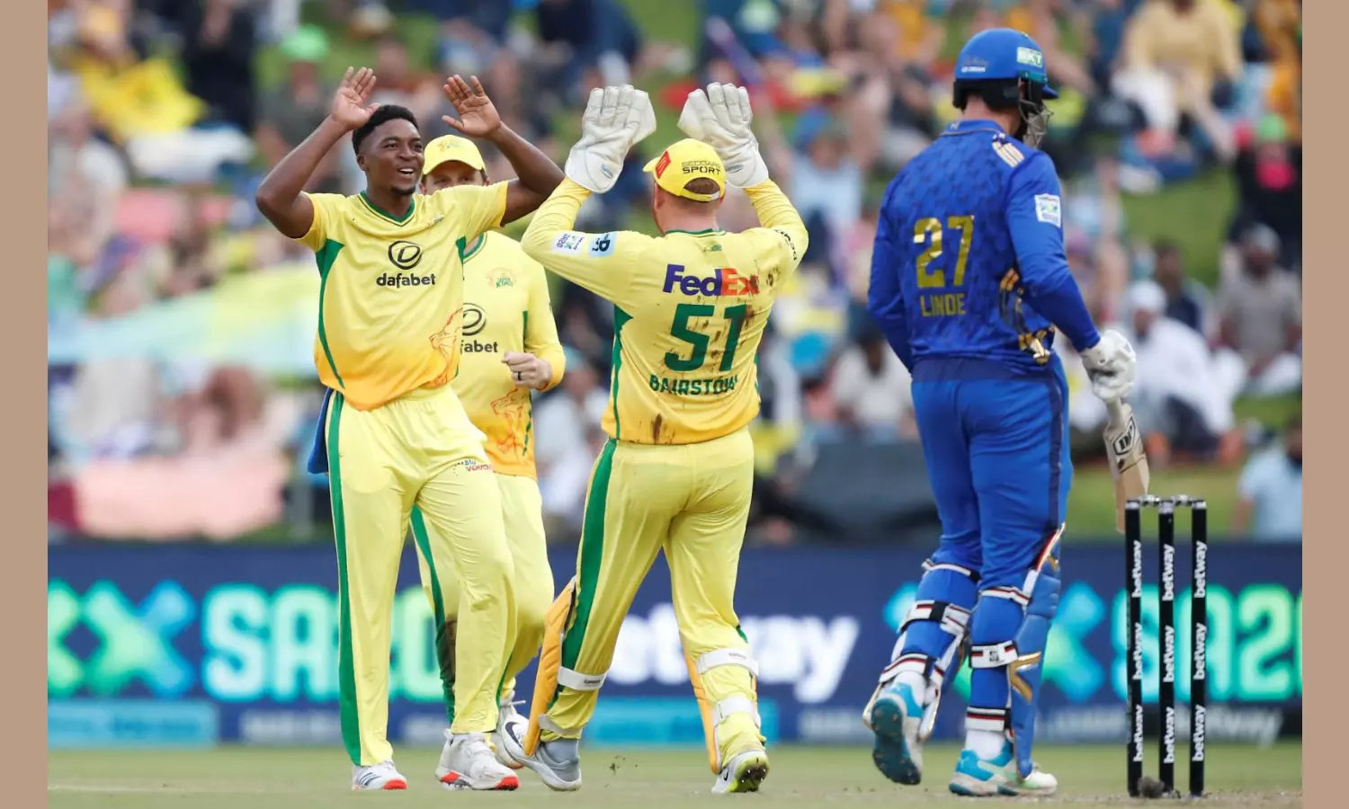 Mindful of the rain JSK captain Faf du Plessis had played a solid knock of 30 off 23 balls before he was dismissed courtesy of a spellbinding catch by Dewald Brevis on the cover boundary when he tipped the ball back infield before diving full length back in field to complete the dismissal.