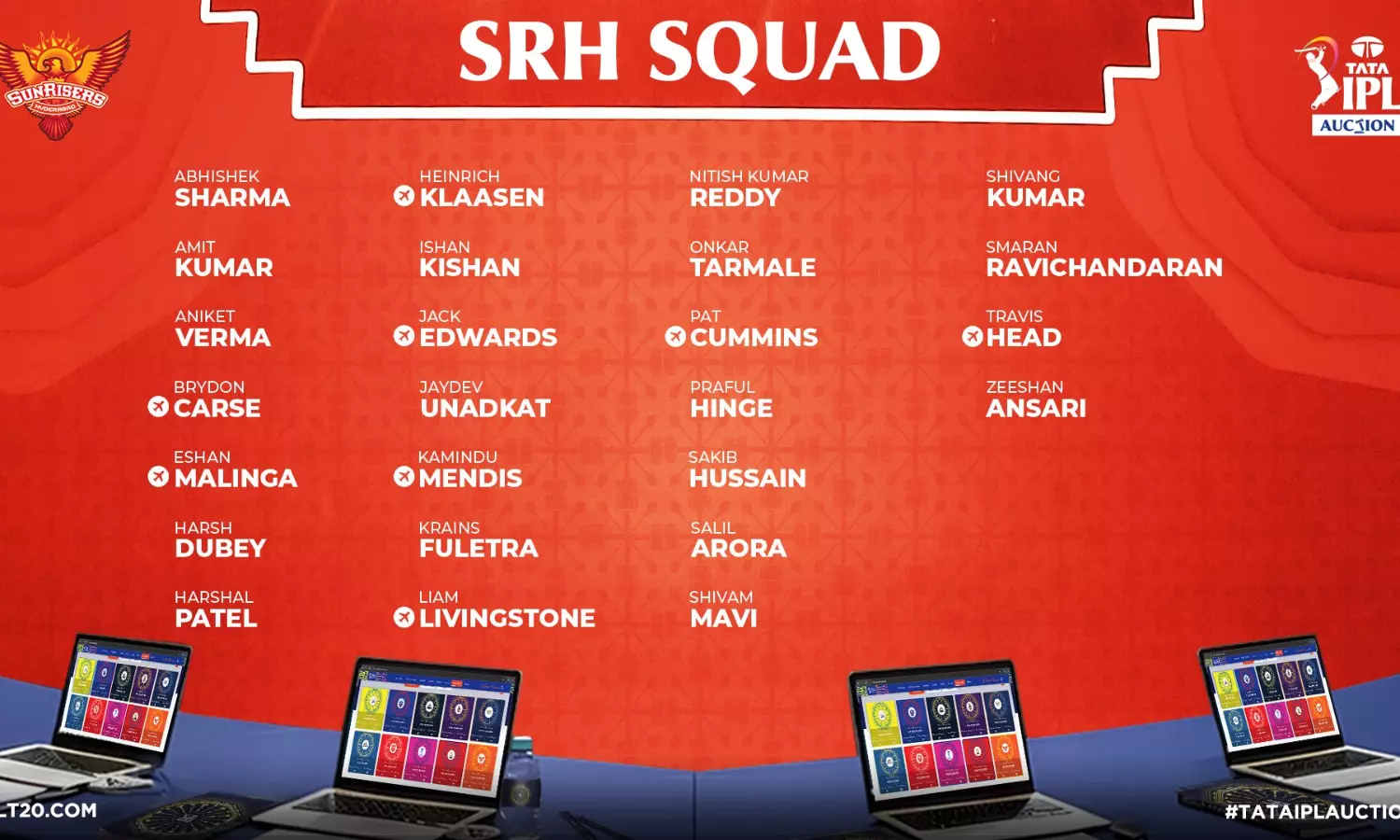 Pat Cummins, Travis Head, Abhishek Sharma, Ishan Kishan, Heinrich Klaasen, Liam Livingstone, Nitish Kumar Reddy, Harshal Patel, Kamindu Mendis, Brydon Carse, Jaydev Unadkat, Shivam Mavi, Eshan Malinga, Zeeshan Ansari, Aniket Verma, R. Smaran, Harsh Dubey, Jack Edwards, Shivang Kumar, Salil Arora, Sakib Huss.