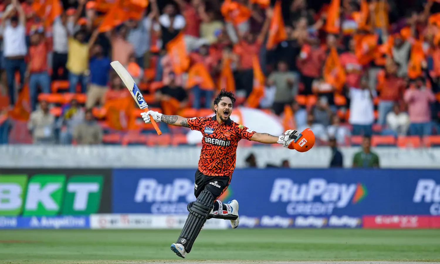 Sunrisers Hyderabad's Ishan Kishan celebrates after scoring a century (100 runs) during the Indian Premier League (IPL) Twenty20 cricket match between Sunrisers Hyderabad and Rajasthan Royals at the Rajiv Gandhi International Stadium in Hyderabad on March 23, 2025. (Photo by Noah SEELAM / AFP)