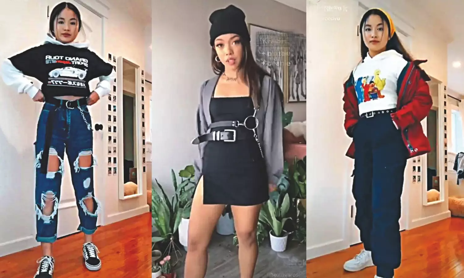 Combat shorts, plaid skirts, and goth accessories exemplify 2020s distinctive aesthetic.
