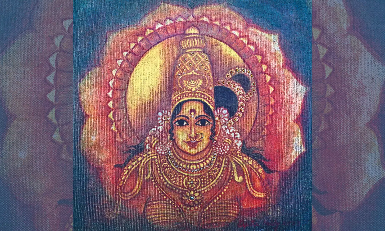Artist Arpitha Reddy is demonstrating Lakshmi, the goddess of abundance, in the show. While Durga slays the inner demons of fear and ignorance, Lakshmi steps in to lend verve. The two goddesses designate the equilibrium between protection and prosperity. “Dasara also acknowledges the symmetry of strength and wellspring.” She explains the co-existence of Durga and Lakshmi, dividing the divine feminine into three triads, each symbolising an aspect of the goddess: “Durga for strength and protection, Lakshmi for wealth and abundance, and Saraswati for wisdom. Haripriya, or Lakshmi, as depicted here, embodies the flourishing energy that sustains life and brings prosperity. However, her connection to Durga is wholehearted. In the cosmic cycle, Durga’s fierce protection creates the space for Lakshmi’s nurturing energy to flow, ensuring abundance not only in material wealth but also in the bottomless aspects of spiritual and emotional fulfilment.”
