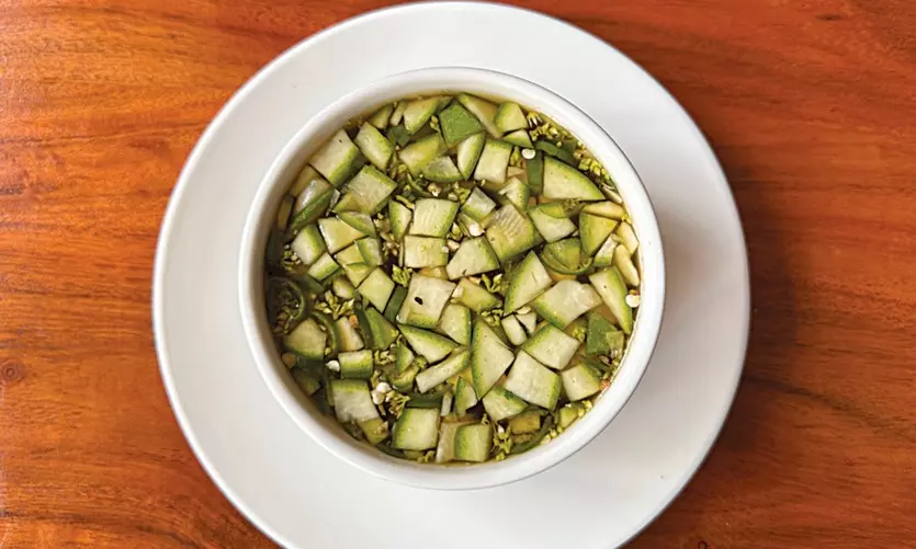 • Add the grated raw mango and cook briefly for about a minute, just until the sharpness softens slightly but the freshness remains.