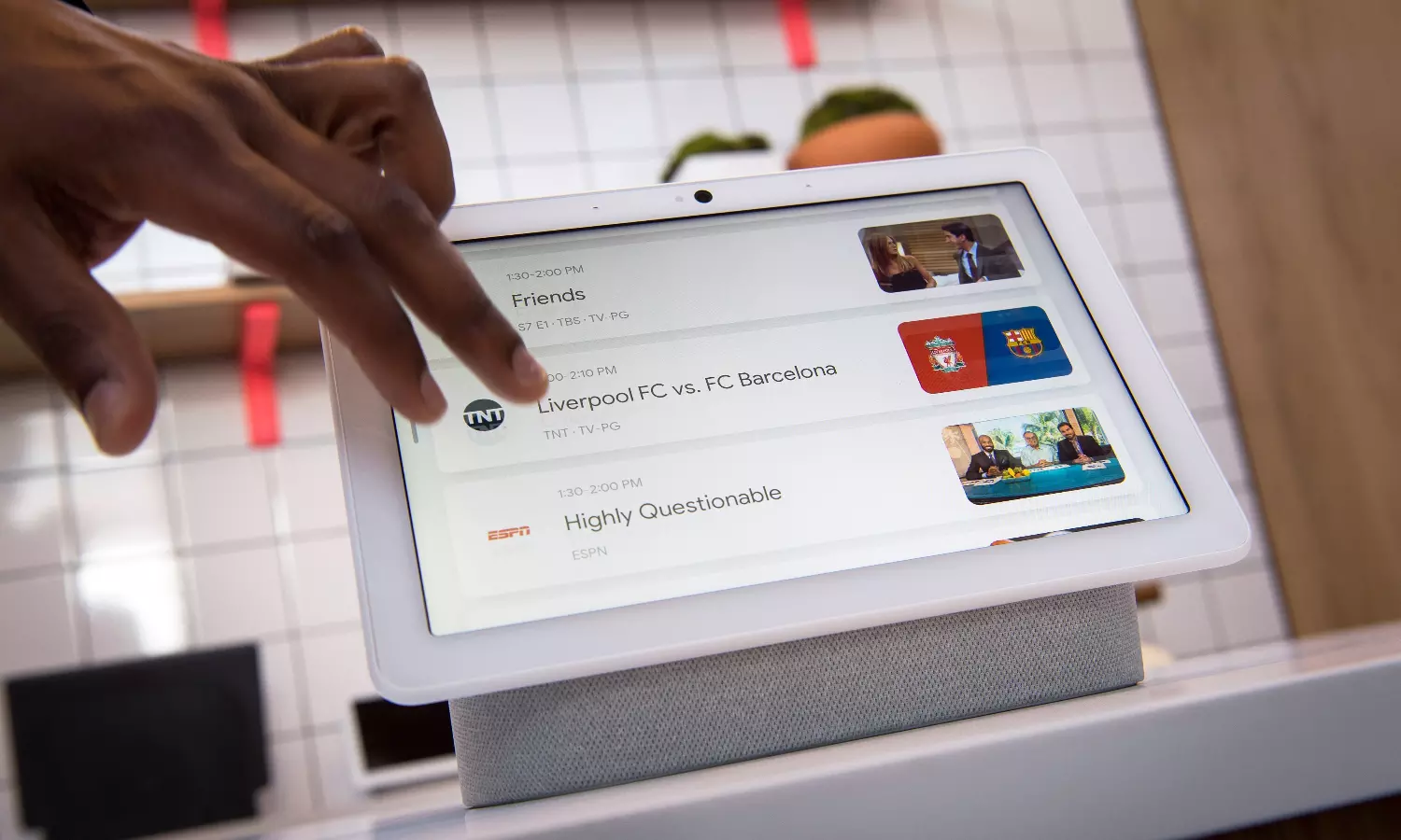 The hardware itself looks similar to a Google Nest Hub but is shaped like a square, with thin black or white bezels and rounded corners.