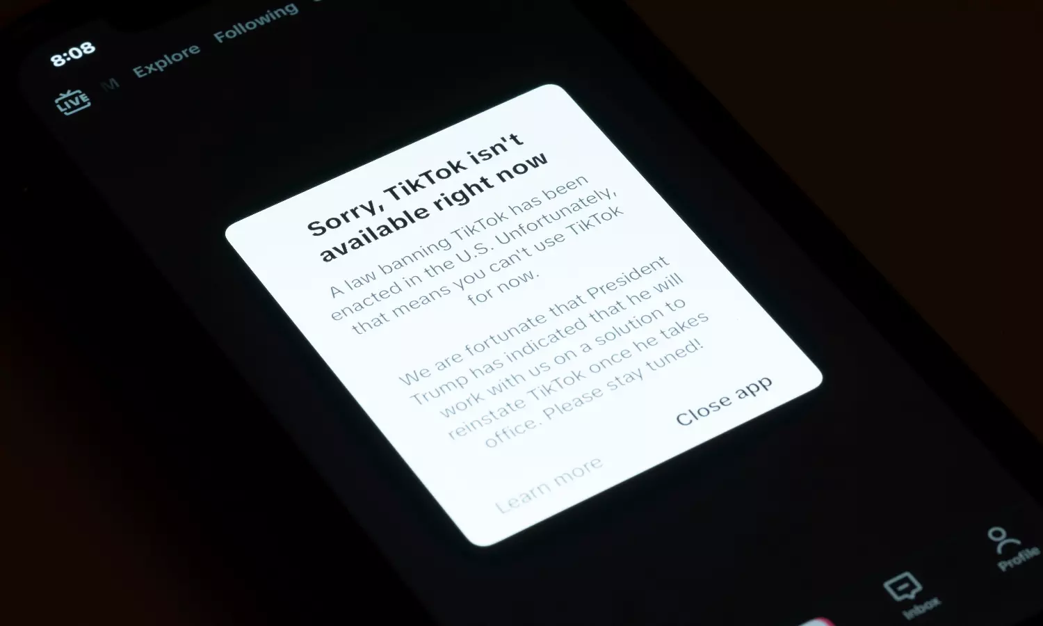 “A law banning TikTok has been enacted in the U.S.,” the message said. “Unfortunately that means you can’t use TikTok for now.”