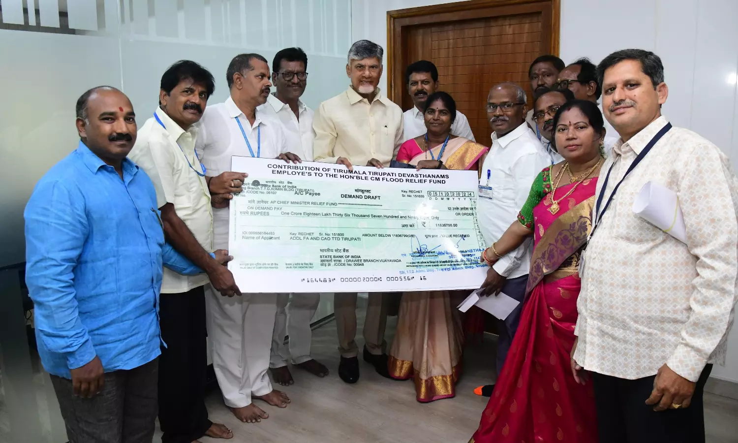 Tirupati: Employees and pensioners of the Tirumala Tirupati Devasthanams (TTD) demonstrated solidarity by contributing to flood relief efforts. They presented a cheque of ₹1,18,36,798 on behalf of employees and ₹71.59 lakh on behalf of pensioners to Chief Minister N. Chandrababu Naidu at his residence in Undavalli on Saturday.