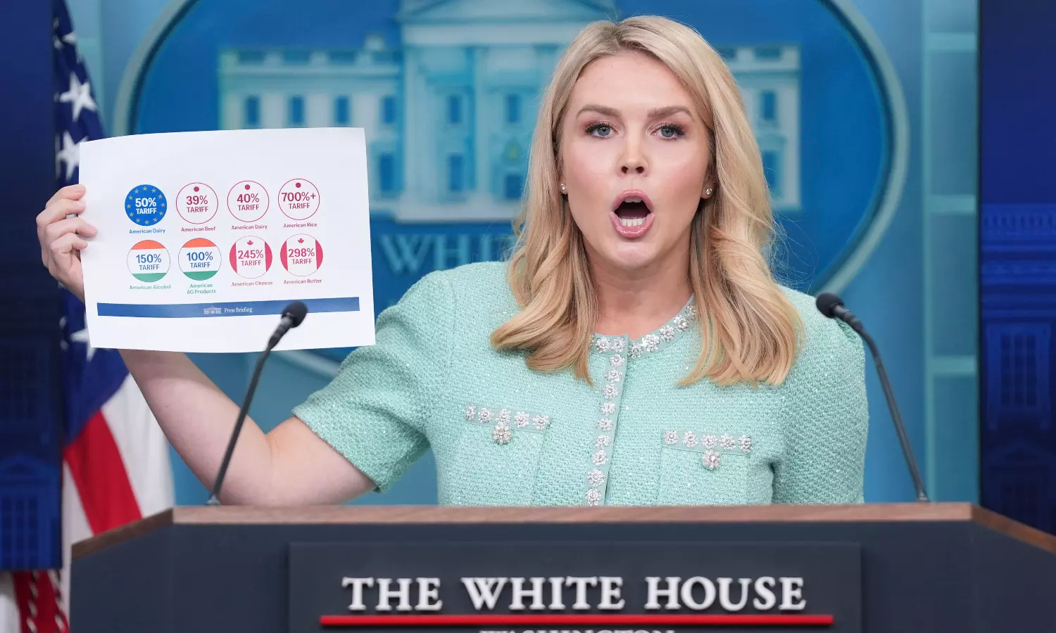 "In fact, I have a handy dandy chart here that shows not just Canada but the rate of tariffs across the board. If you look at Canada since you brought it up American cheese and butter nearly 300 per cent tariff. You look at India, 150 per cent tariff on American alcohol. Do you think that's helping Kentucky bourbon be exported into India? I don't think so. 100 per cent tariff on agricultural products from India," Leavitt said.