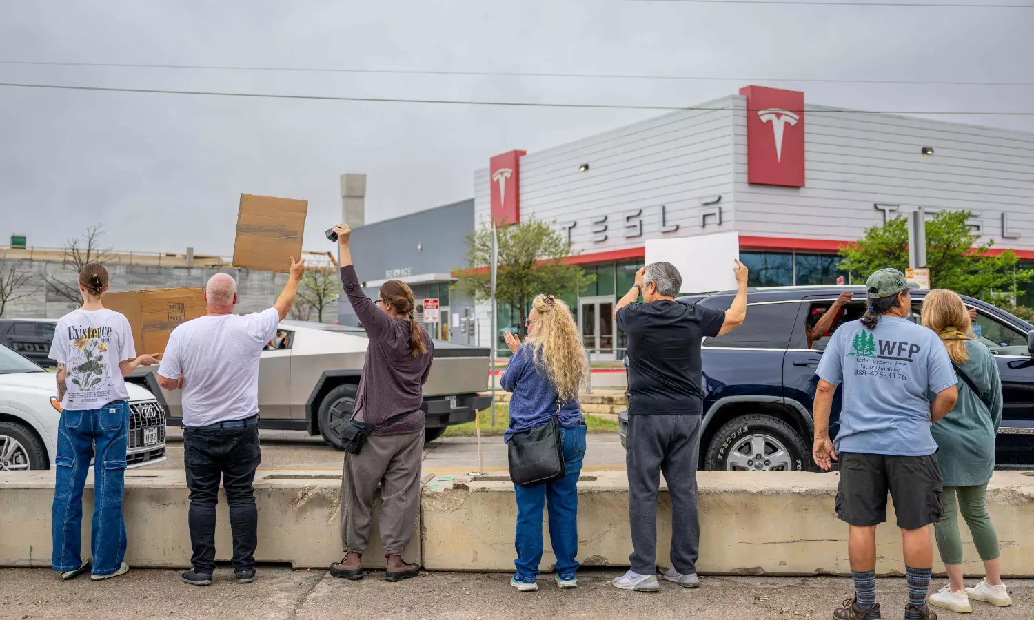 In Watertown, Massachusetts, local police reported that the side mirror of a black pickup struck two people at a protest outside a Tesla service center, according to the Boston Herald . The suspect was promptly identified by police at the scene, who said there were no serious injuries.