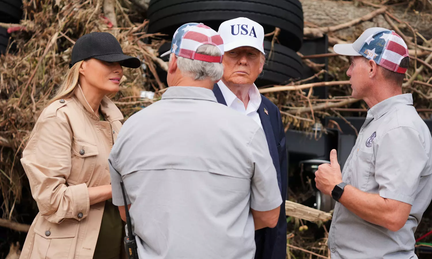 Seeing the damage close-up Prior to the roundtable, Air Force One landed in San Antonio and Trump deplaned in a suit while the first lady wore more casual clothing — though both wore ball caps against the heat. The Trumps then boarded a helicopter to Kerrville and saw the flooding aftermath from the air. They later walked close to the Guadalupe River to receive a briefing from officials near an overturned tractor trailer, numerous downed trees and other debris.
