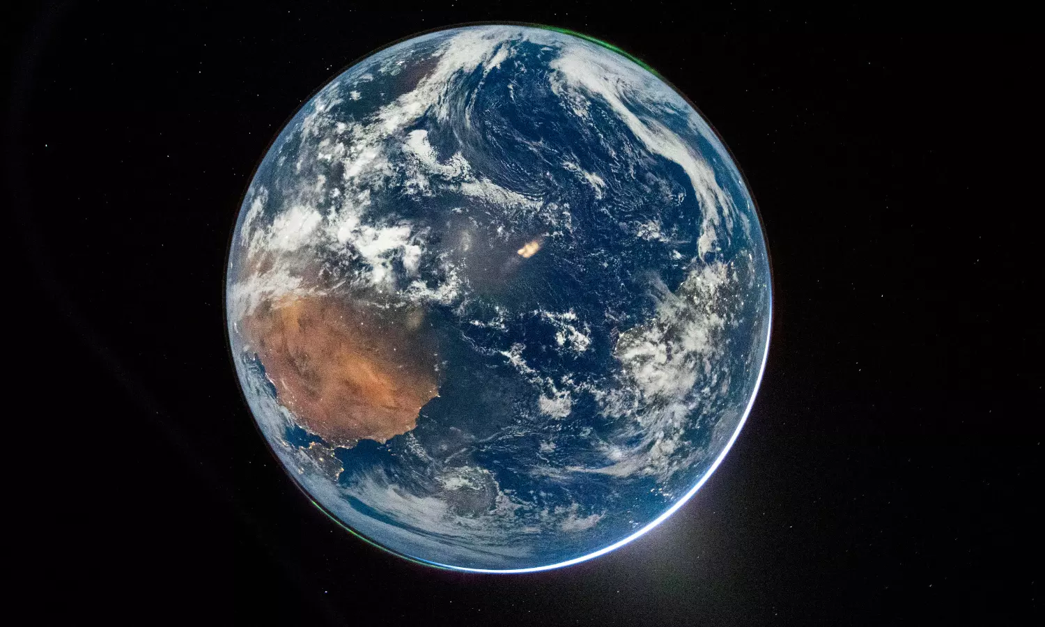 The first photo taken by commander Reid Wiseman shows a curved slice of Earth in one of the capsule’s windows. The second shows the entire globe with the oceans topped by swirling white tendrils of clouds. A green aurora even glows, according to NASA.