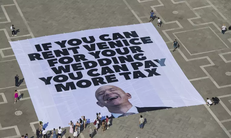 “The city is overwhelmed by tourists, flooding is constant, and ordinary residents are priced out — yet the super-rich use it as their playground,” said Flavio Cogo, a local activist.
