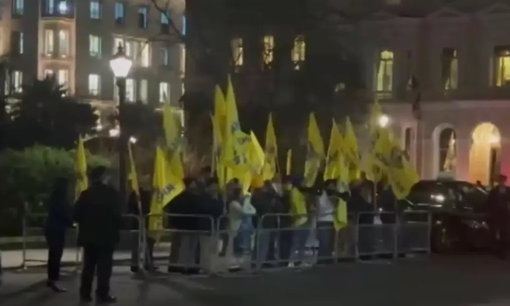 The protestors had gathered outside the building, holding flags and speakers as they sloganeered.