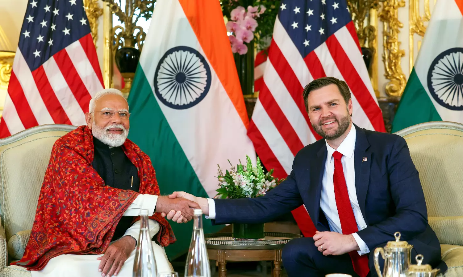 “Today, Vice President JD Vance met with Prime Minister of India Narendra Modi. The two leaders, along with the Second Lady of the United States Usha Vance, enjoyed coffee together and discussed topics of mutual interest, including how the United States can assist India in diversifying its energy sourcing through investments in clean, reliable US nuclear technology. Prime Minister Modi graciously shared gifts with the Vance children and wished the Vice President's son, Vivek, a happy birthday,” the statement read.
