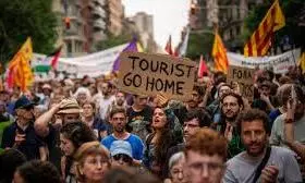 "Your holidays, my misery," protesters chanted in the streets of Barcelona while holding up banners emblazoned with slogans such as "mass tourism kills the city" and "their greed brings us ruin".