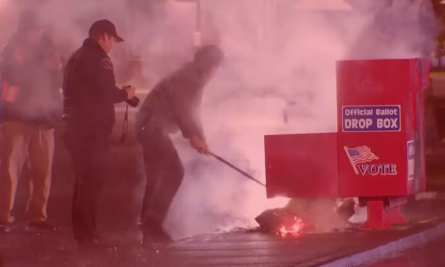 In Vancouver, Washington, a city just north of Portland, a ballot box was severely damaged, destroying hundreds of ballots. Local reports indicate that an explosive device had been attached to the box. Meanwhile, another incendiary device was ignited in a Portland ballot drop box, causing minor damage and affecting three ballots.
