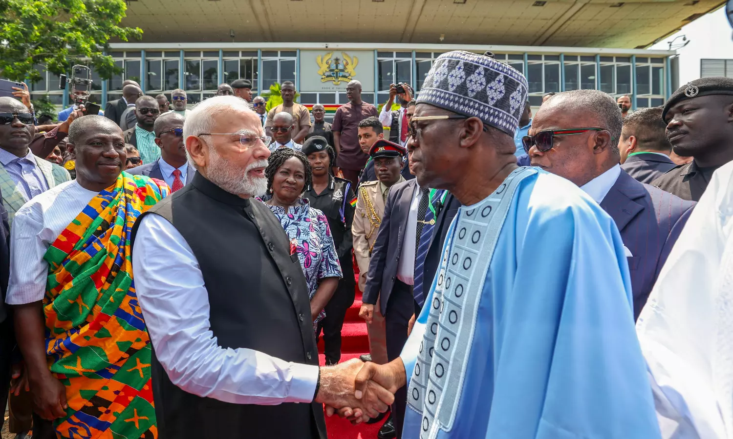 In a special gesture, the prime minister was received at the airport by President Mahama and was accorded a ceremonial welcome. It is the first prime ministerial visit from India to Ghana in three decades.