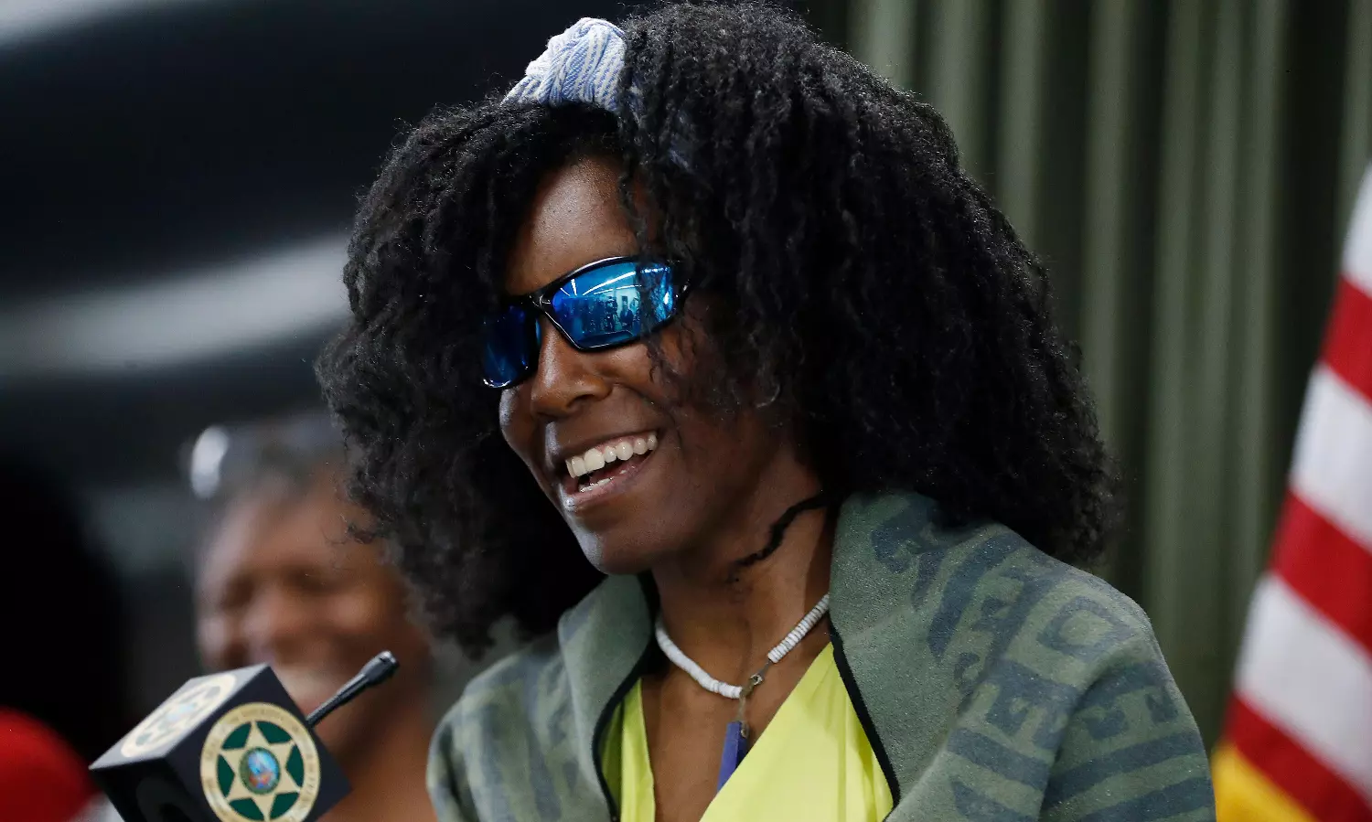 Tiffany Slaton, center, a hiker found in the High Sierra after going missing for three weeks, speaks during a press conference as her dad, Bobby, and mom, Fredrina look on, Friday, May 16, 2025 in Fresno, Calif. (AP Photo/Gary Kazanjian)