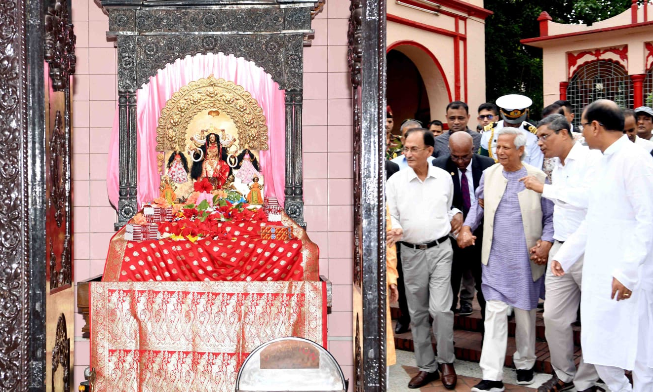 On Tuesday, after reaching the Dhakeshwari temple, Yunus exchanged greetings with the leaders of Bangladesh Puja Udjapan Parishad and Mahanagar Sarbajanin Puja Committee, as well as officials from the temple management board and devotees, The Daily Star said.