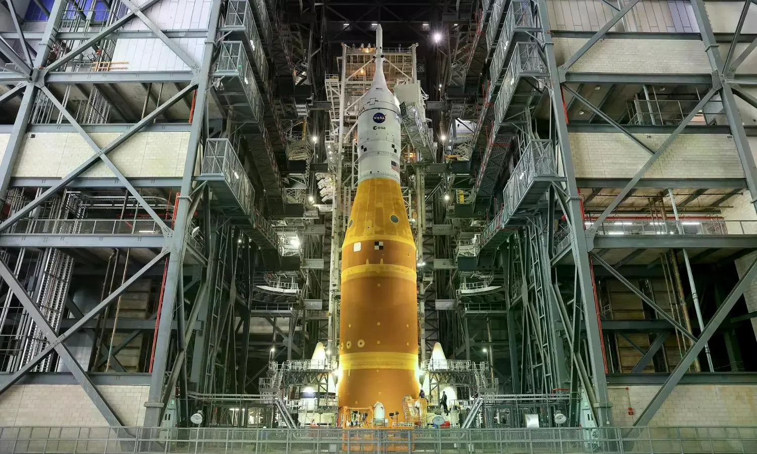 The immense orange and white Space Launch System rocket and the Orion vessel were to be slowly wheeled out of the Vehicle Assembly Building at the Kennedy Space Center in Florida, and painstakingly moved four miles (6.5 kilometers) to Launch Pad 39B.