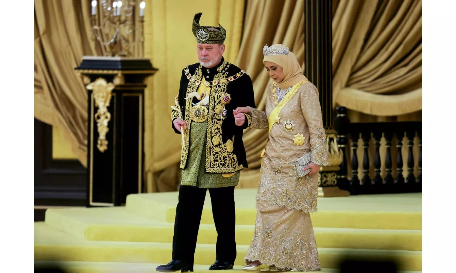 Donned in black and gold traditional ceremonial outfit and headgear, Sultan Ibrahim and Queen Raja Zarith Sofiah were greeted by military salute before they proceeded to the throne. The heads of the other royal families, Brunei Sultan Hassanal Bolkiah and Bahrain King Hamad Isa al Khalifa were seated on a stage beside the throne.