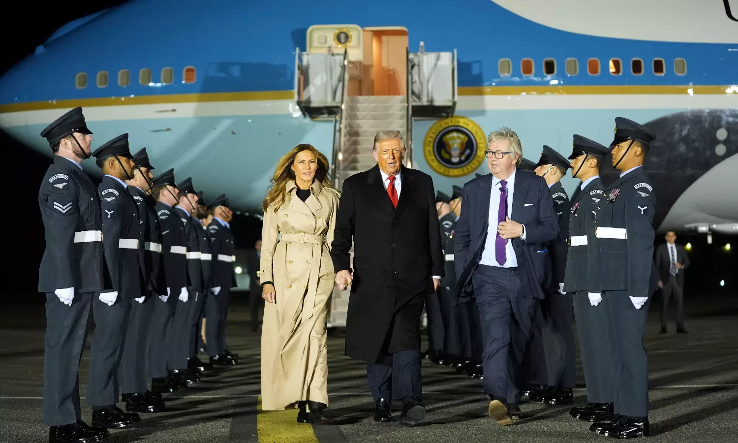 In a sign of the pomp and pageantry to come, a guard of honour greeted the Trumps as they stepped off Air Force One at Stansted Airport near London.