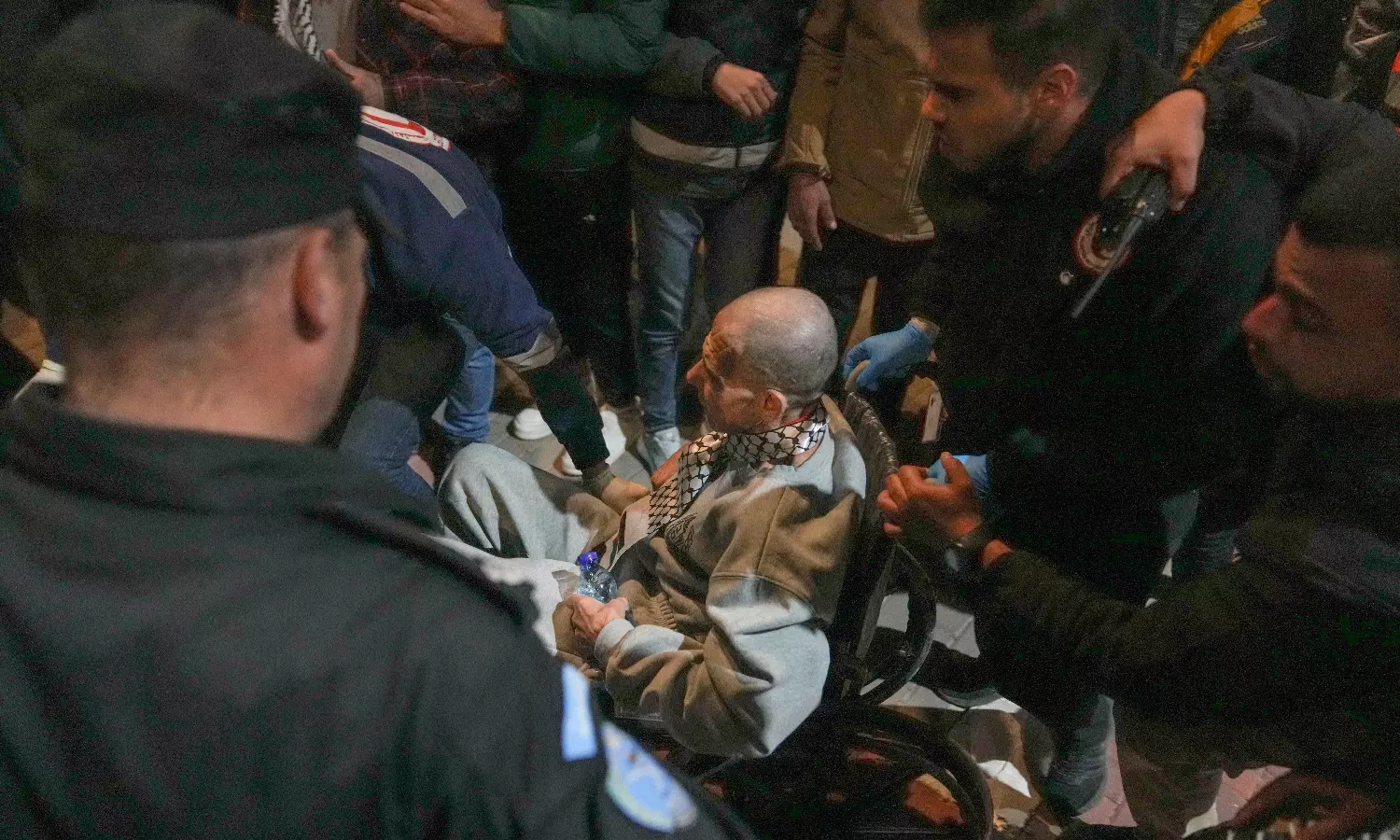 The first to disembark from the bus at the Ramallah sports complex where the two vehicles arrived was former top militant leader Zakaria Zubeidi, 49, who stepped out flashing a victory sign.