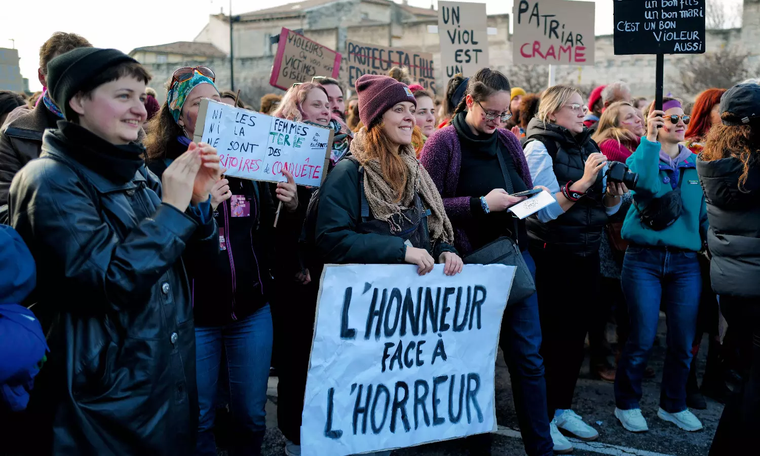 One large banner displayed on a wall read: “Rape has no nationality.” Elsewhere, activists posted notes with “Gentle words for Gisèle” on a fence.