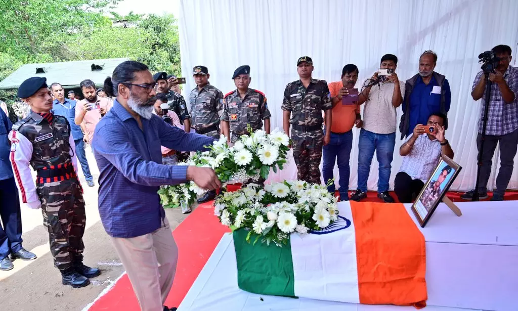 Soren and Governor Santosh Kumar Gangwar paid floral tributes to the mortal remains of jawan, Sunil Dhan, who lost his life in an IED blast in West Singhbhum district on the previous day.