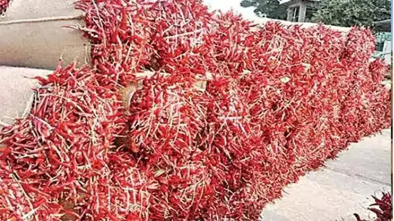 The indigenous ‘Desi’ variety touched a three-year high of Rs 41,200 per quintal on Tuesday, while ‘Yellow Chilli’ fetched up to Rs 44,000 per quintal. Market officials said such rates had not been recorded in the last three to four years.