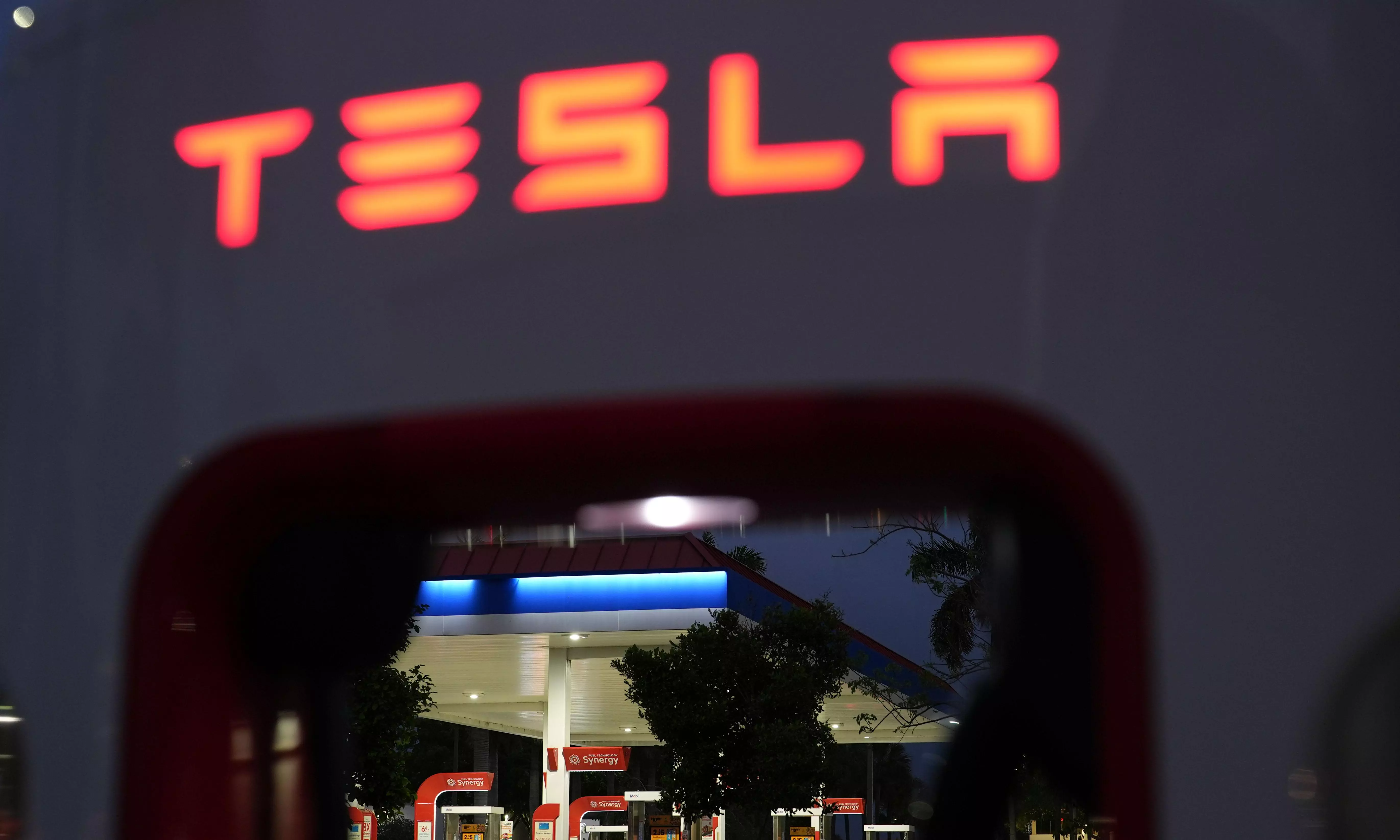 Cars fueling at a gas station are seen through a Tesla Supercharger, in the Kendall area of Miami, Thursday, April 2, 2026. (AP Photo/Rebecca Blackwell)