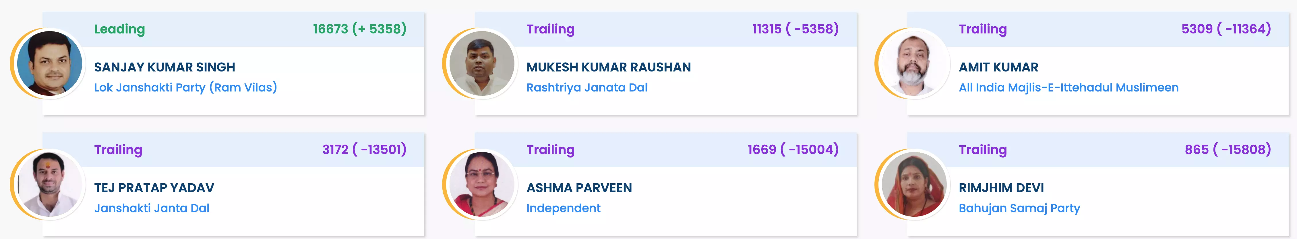 Lalu Prasad Yadav's son and JJD chief Tej Pratap Yadav trailing by a margin of 13,501 votes in Mahua.