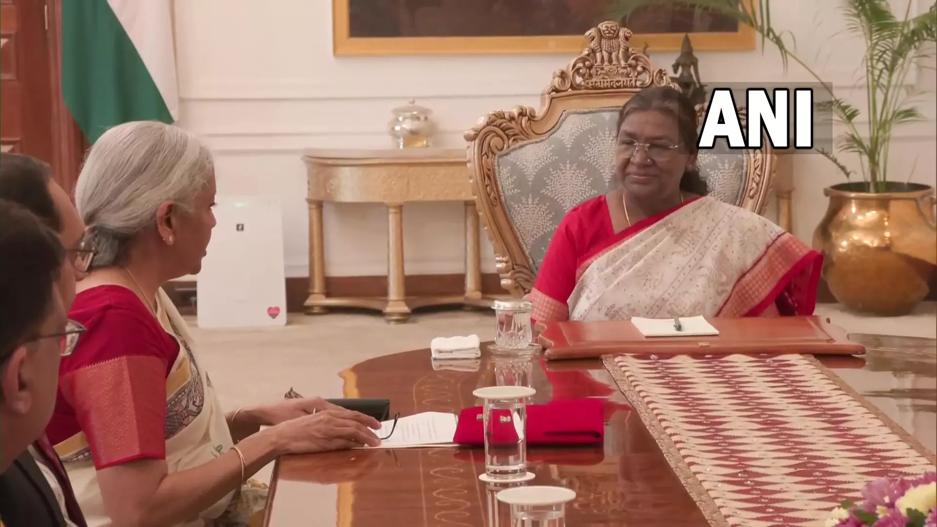 Union Finance Minister Nirmala Sitharaman and MoS Finance Pankaj Chaudhary meet President Droupadi Murmu at Rashtrapati Bhavan.