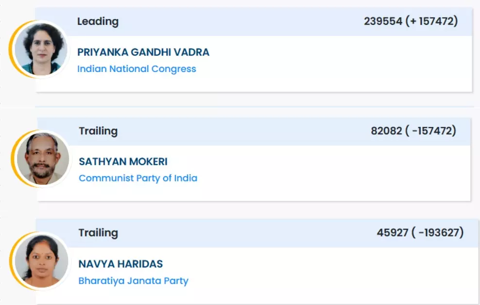 Priyanka Gandhi leads by 1,57,472 votes in Wayanad Lok Sabha bypoll: ECI trends
