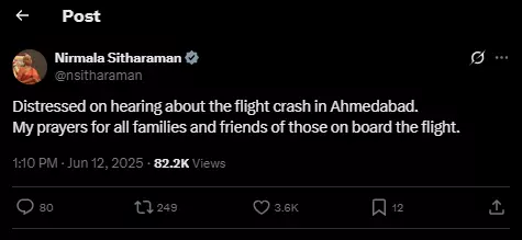 Finance Minister Nirmala Sitharaman expressed distress over the Ahmedabad plane crash. "Distressed on hearing about the flight crash in Ahmedabad. My prayers for all families and friends of those on board the flight," she posted on X.