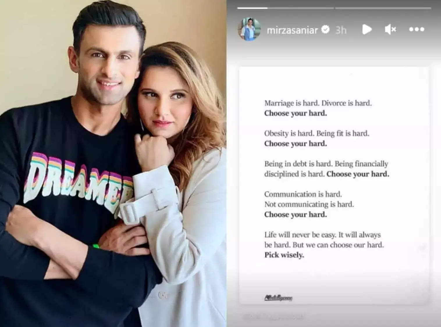 Sania's latest Instagram post has added momentum to the ongoing rumors, as she reflects on the challenges of marriage and divorce. In her post, she addresses the difficulties of life choices, drawing parallels between the challenges of relationships, health, finance, and communication.