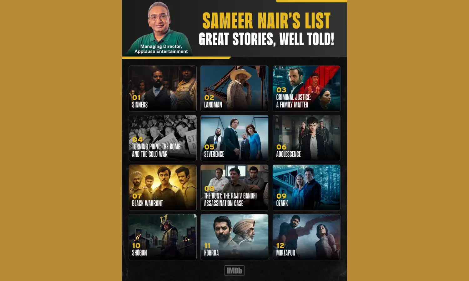A major creative force in Indian entertainment, Sameer Nair has been instrumental in shaping the industry's evolution over three decades. As Managing Director of Applause Entertainment, which he founded in 2017, Nair has been one of the pioneers in the streaming revolution in India. His production house has delivered acclaimed series, including the Criminal Justice franchise and the Scam series (Scam 1992: The Harshad Mehta Story and Scam 2003 - The Telgi Story). The recent success of this year’s Black Warrant further cements Applause Entertainment's reputation for compelling storytelling across major streaming platforms. Recently, Nair exclusively curated his personal list of 12 must-watch films and series on IMDb that have made a huge impact on him.