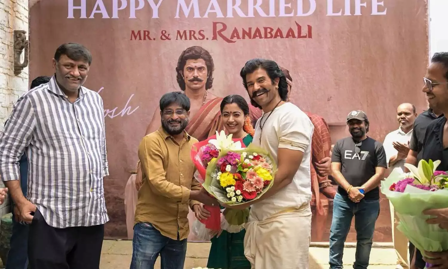 Producers Naveen Yerneni and Y. Ravi Shankar celebrated the newlyweds by cutting a cake and offering well-wishes on behalf of the entire unit, greeting them with, “Happy married life, Mr. and Mrs. Ranabaali.”